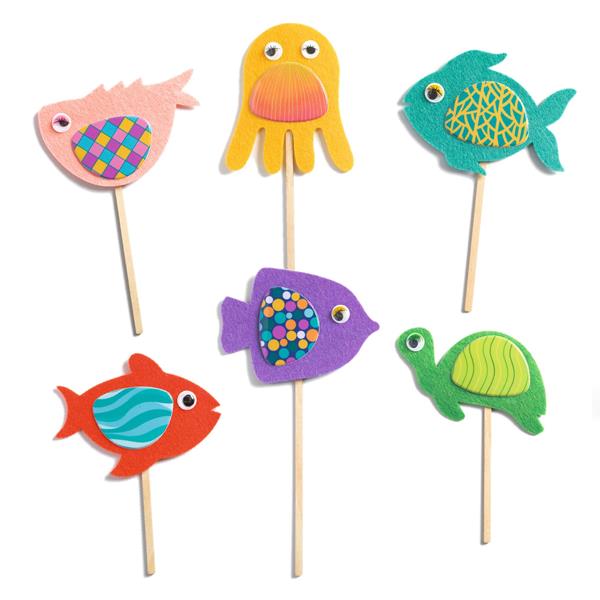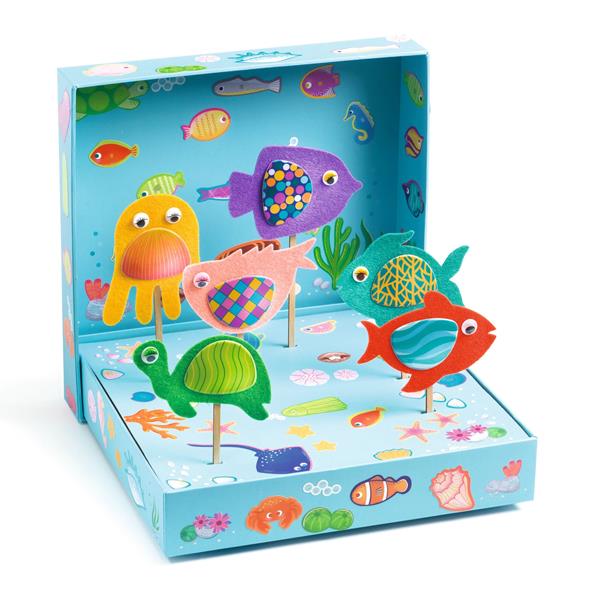 6 wooden lolly sticks, 6 felt shapes, 12 googly eye stickers, 9 foam stickers, 130 paper stickers, 1 seabed sheet and 1 booklet.