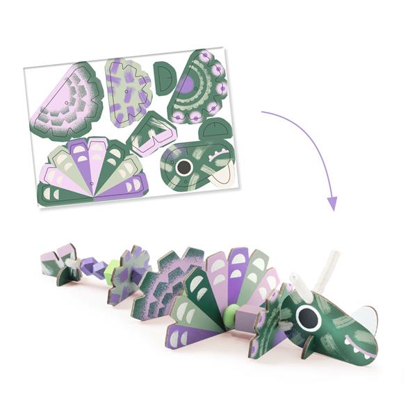 An original activity to bring 3 friendly yet terrifying dinosaurs to life! The child threads wooden beads and thick cardboard pre-cut pieces onto the pipe cleaners to create models. An activity that stimulates creativity, fine motor skills and imagination, with countless combinations for children to invent their own dinosaurs.
