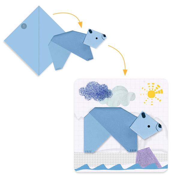 A simple and guided first folding activity to create adorable paper animals. The child folds 3 sheets, the folding lines are already marked, then puts together the animal and sticks it onto its background to create 5 beautiful 3D pictures. All the materials are included: from the folding stick to double-sided foam stickers, for a fun introduction to the art of folding and origami.