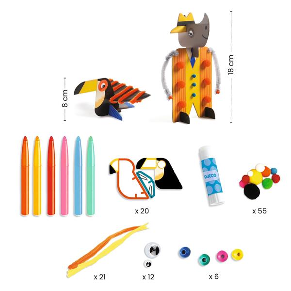 A comprehensive arts and crafts kit that involves bringing 3 funny big characters and their crazy but endearing pets to life...and they all stand up! The child punches out each piece then, colours, assembles and decorates using the wide variety of materials provided: felt tips, wooden beads, pipe cleaners, pompoms... Nothing goes to waste: even the box can be colored. A rich and ingenious creative experience to make 6 unique models.