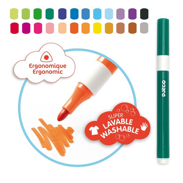 24 super-washable felt tips. Super-washable ink, vibrant colours... 24 colours to unleash children’s imaginations! An ergonomic triangular shape for an easy hold. Content : 24 ultra-washable felt tips.