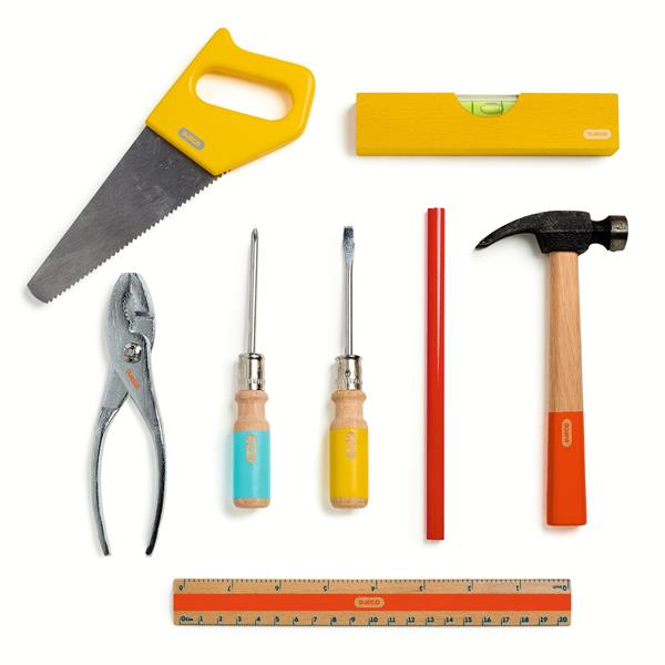 8 pieces: hammer, flat-head screwdriver, cross-head screwdriver, pliers, saw, spirit level, ruler and pencil.