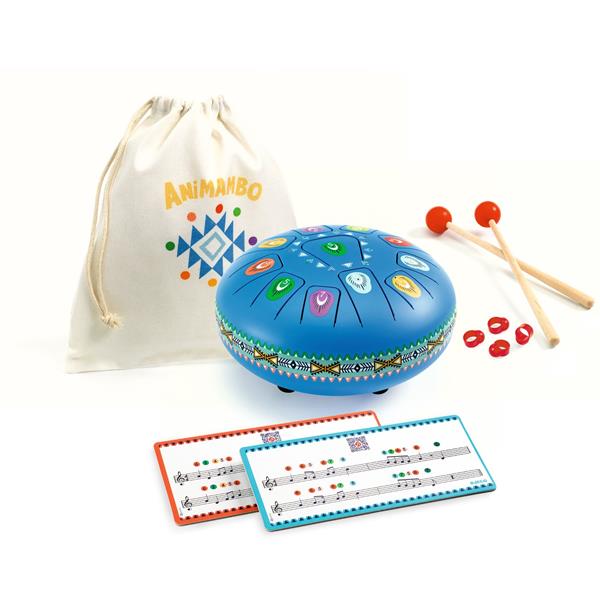 1 steel drum (diameter: 20 cm) with 11 tongues, 2 wooden drumsticks (length: 16.5 cm) with a 2 cm diameter rubber tip, 4 finger picks, 1 storage bag and 2 thick double-sided cards with music scores (18 x 8.5 x 0.2 cm).