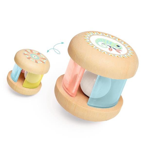A rattle made of natural wood, decorated with pastel colours, for babies from 3 months. A large wooden ball that moves inside coloured see-through panels, creating fascinating visual and sound effects. Content : 1 rattle (wood and plastic).