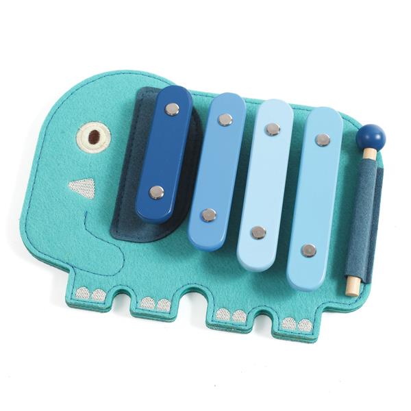 A wooden and felt xylophone shaped like an elephant, brightly coloured and made for little hands. The child plays the 4 notes using the wooden beater, discovering their first melodies. The felt adds softness and volume while remaining lightweight, for a fun and sensory first musical instrument.