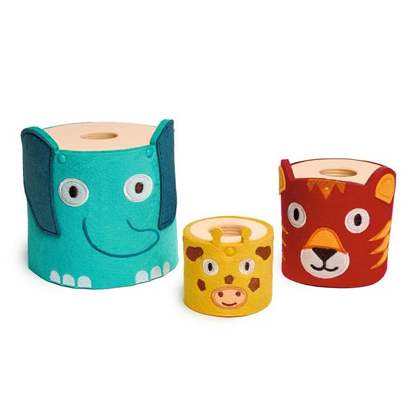 Three wooden and felt stackable cubes, designed for little ones. Shaped like an elephant, tiger and giraffe, they can be stacked to build or fitted together for storage and play. The felt adds softness and volume while remaining lightweight, and the printed and embroidered details provide a lovely and long-lasting finish. A modular game that develops creativity and coordination, and encourages free play.