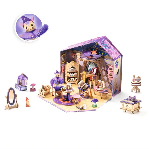 1 little house (closed size: 14.5 x 16.5 x 5 cm), 2 stained wooden boards, 1 palette of dry paints and 1 paintbrush, 1 protective tablecloth, 3 sheets of pre-cut illustrated card, 3 sheets of stickers (1 sheet of illustrated stickers, 1 sheet of small transparent stickers, 1 sheet of double-sided foam stickers), 4 pipe cleaners, 1 illustrated wooden head and ears, 1 imitation crystal ball bead, 1 spool of thread, 1 sheet of pre-cut illustrated felt, 6 brad fasteners, 1 cardboard tool for making the mini character, 1 pair of precision tweezers, 1 tube of liquid glue with a fine tip, 1 set of detailed instructions.