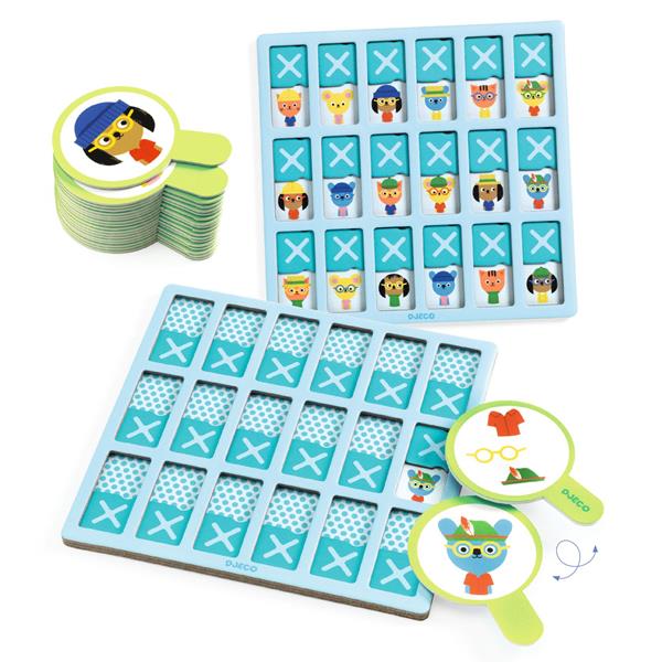 An observation game that involves deduction and handling pieces, made for little ones! The child looks for the right character among 18 cute animals wearing a hat, glasses and a t-shirt. By covering the animals that don’t match on their board and using the magnifying glass to check, the child develops their observation skills, sense of logic and concentration. A game that’s easy to grasp, enjoyable, allows children to correct themselves and encourages them to think, all while having fun.