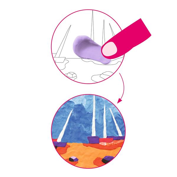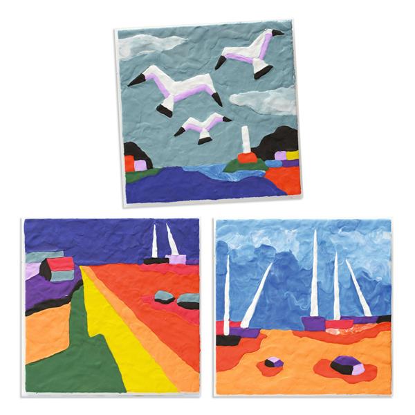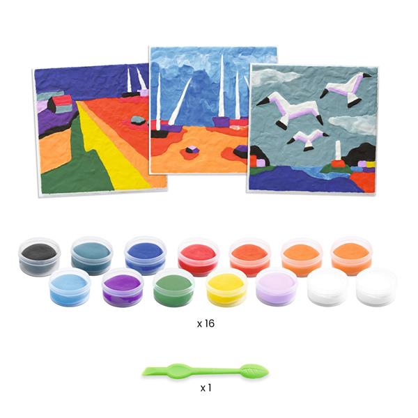 This kit uses modelling clay in a totally unique way, as a sort of finger painting that involves sculpting material. The modelling clays can be spread and mixed and they air dry. 3 pictures to complete as a tribute to De Staël’s passion for working with material.