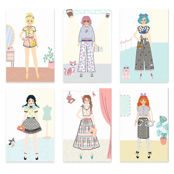 An arts and crafts kit for aspiring designers! The child chooses a silhouette card and uses the pre-cut clothes as stencils to easily copy them onto their drawing. Next, they pick a pattern from the sheets provided and complete their creation with the golden stickers. Each design becomes a truly original and custom stylist’s creation.