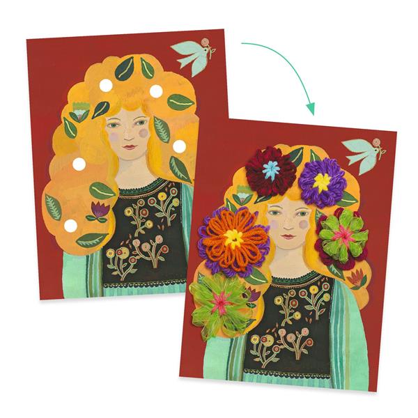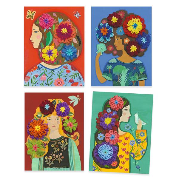4 tableaux à décorer (21x 28cm), 1 outil de façonnage de fleurs, 6 écheveaux de laine, 4 d'organza, 3 de laine-chenille, 1 aiguille à laine souple, 1 feuille d'adhésifs double face, 1 mètre en papier.